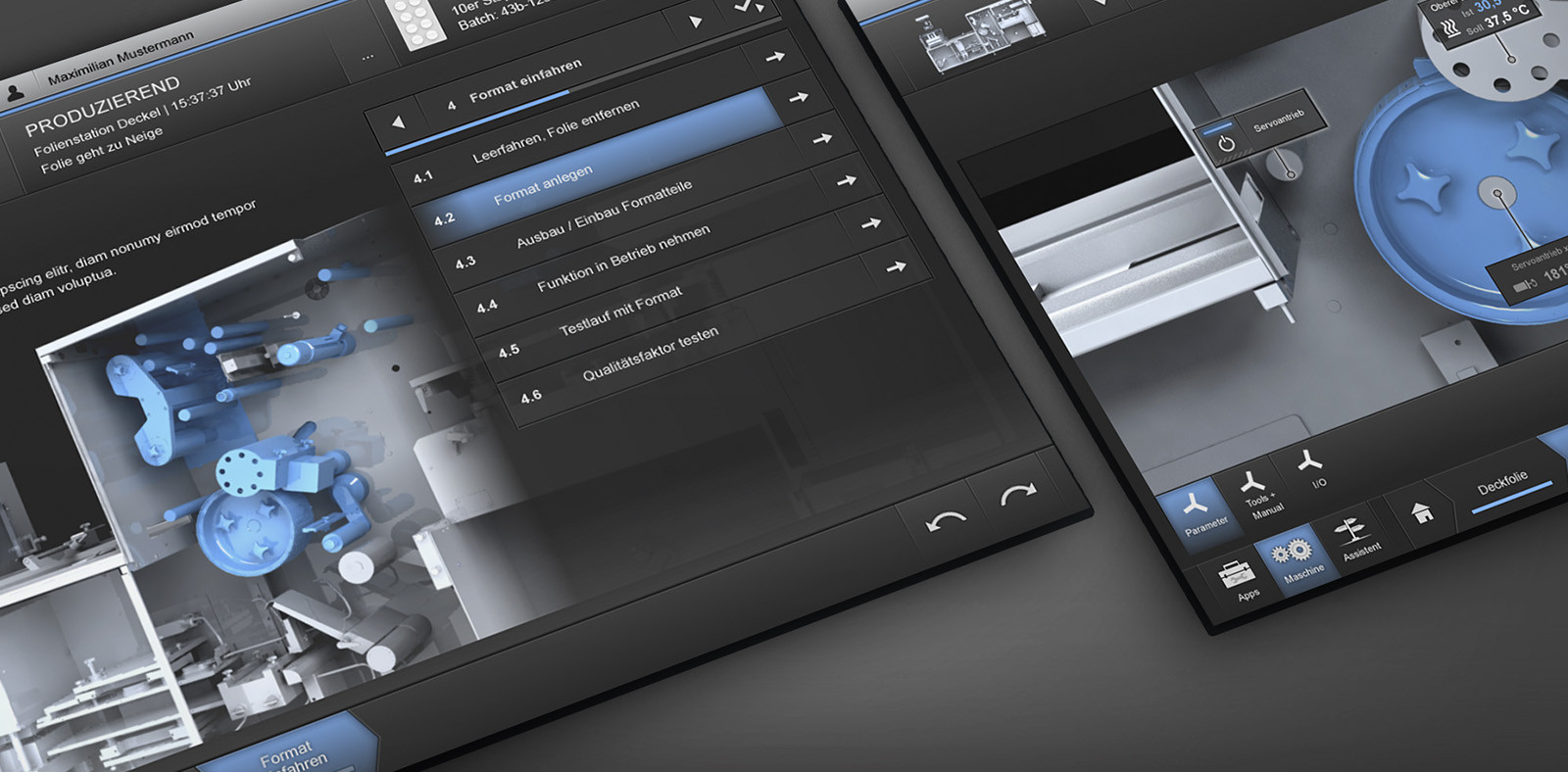 Starke Kontraste, brillante Farben und dezente Leuchteffekte erzeugen eine hochattraktive Hightech-Anmutung. Der Einsatz von reduzierten und harmonisch gerenderten Original-CAD-Maschinendaten ermöglicht eine verständliche und übersichtliche Darstellung der zu steuernden Baugruppen.